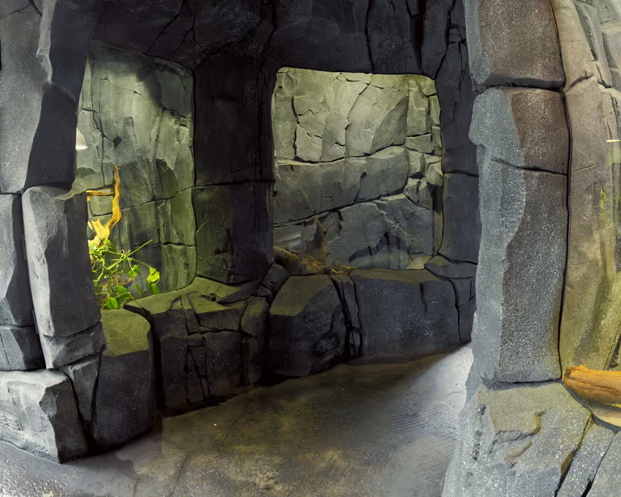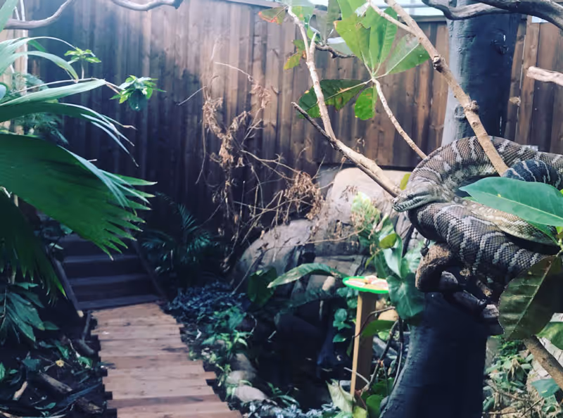 I Regnskogen finner du også Reptilgrotta! Her er det et spennende utvalg av flotte reptiler i flotte terrarier. Du har muligheten til å studere de spennende dyrene med et trygt glass i mellom. Det varierer hvilke reptiler vi viser frem i utstillingen.